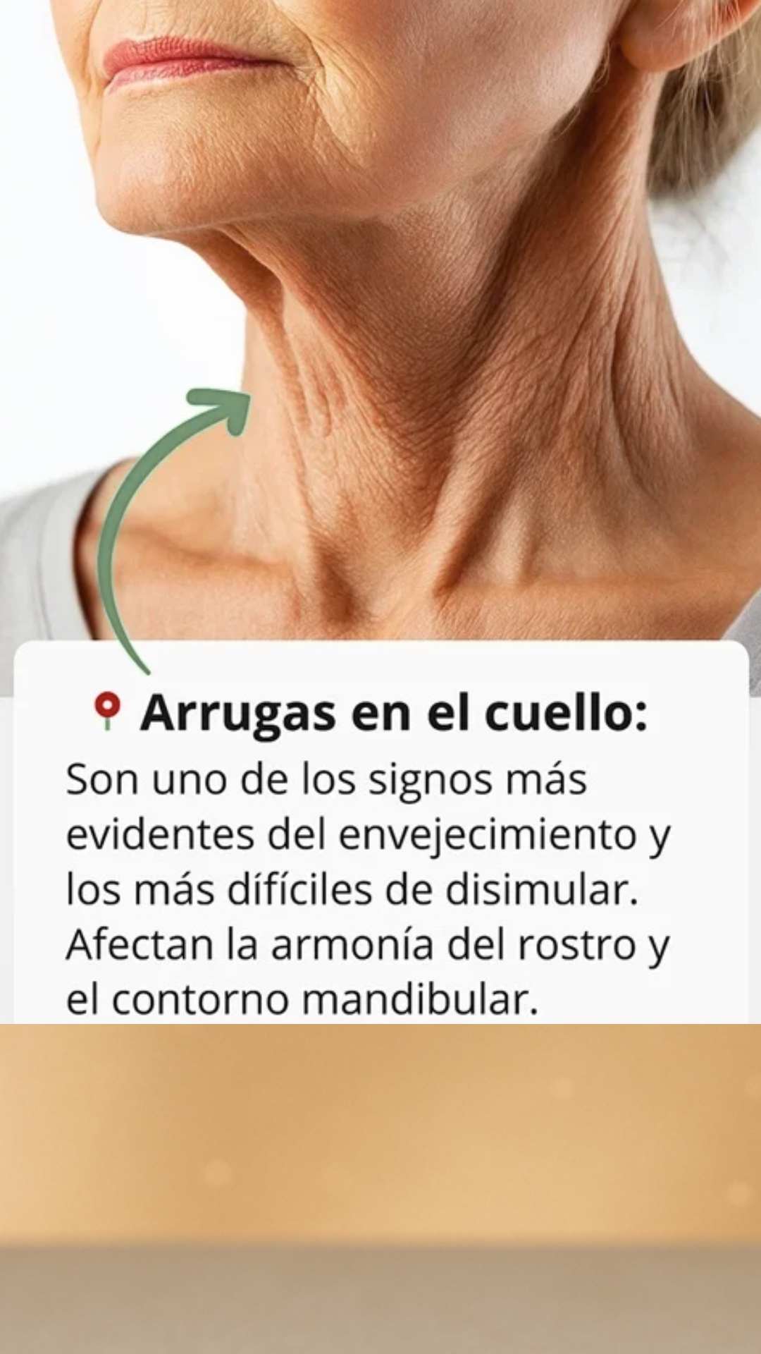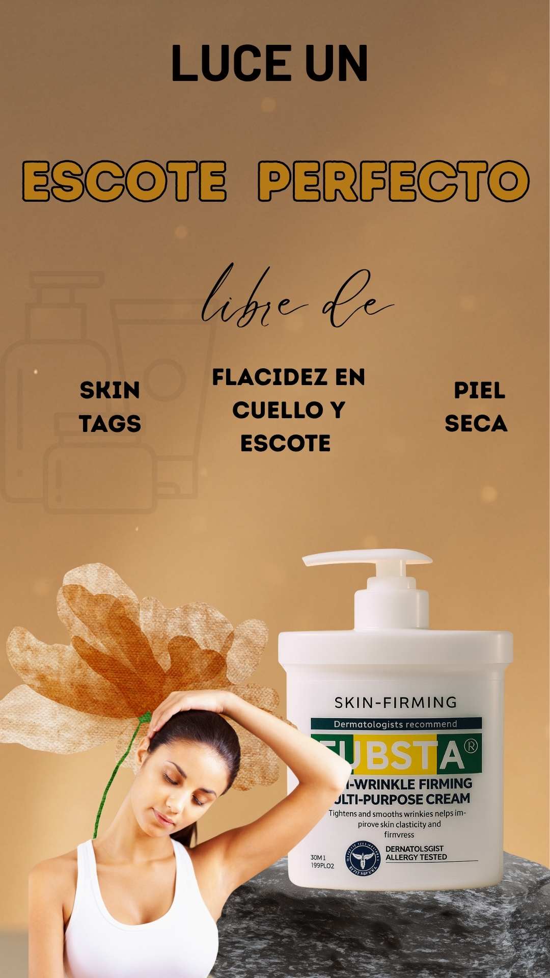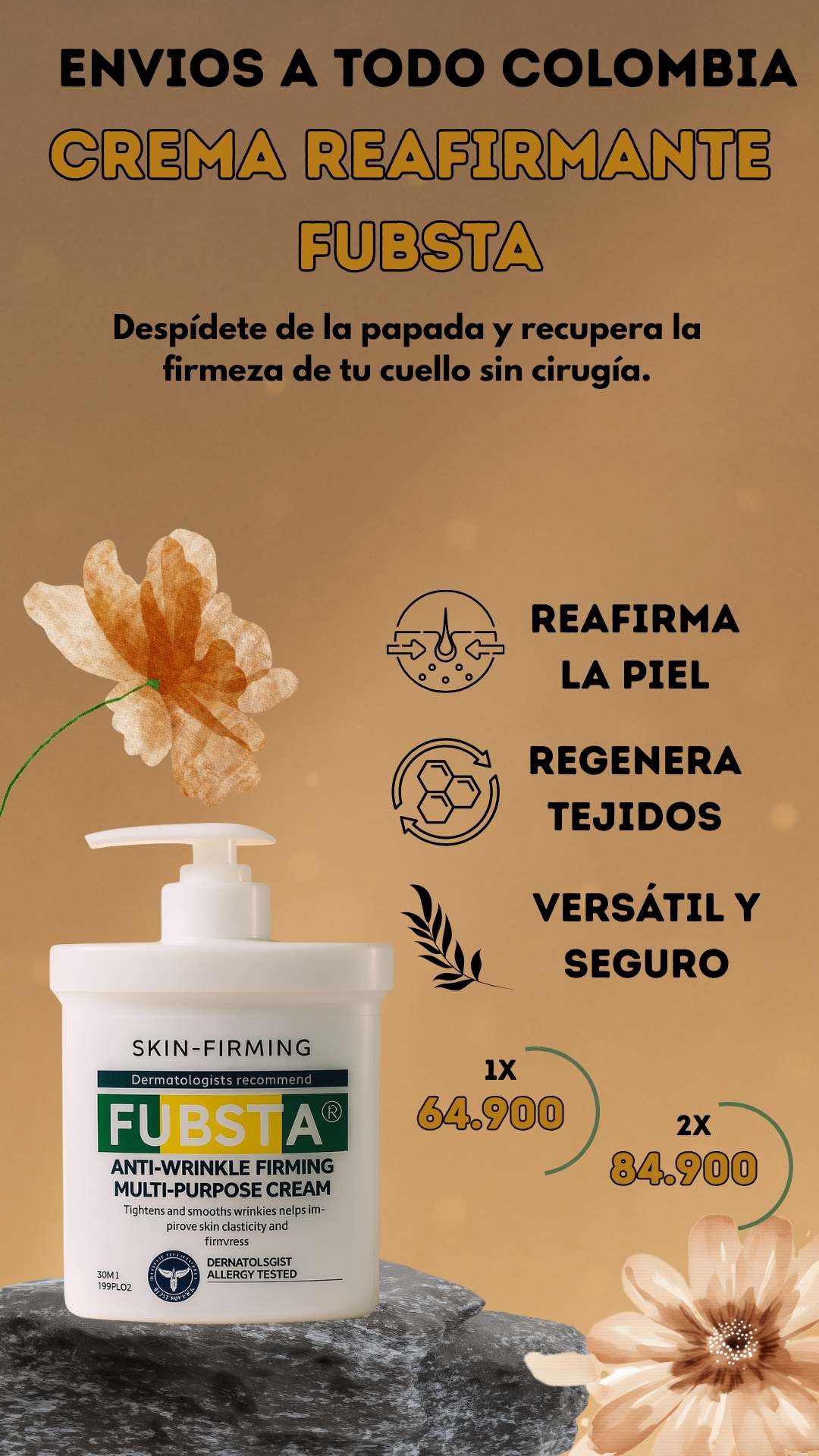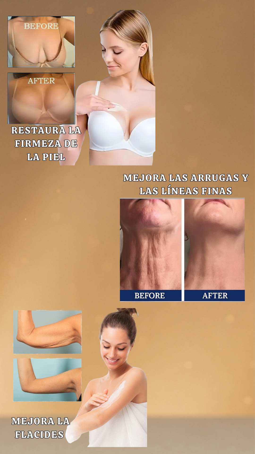 Está diseñada para reafirmar y alisar la piel del cuello, papada, escote, brazos, abdomen y rostro, ayudando a mejorar la firmeza y elasticidad en todas esas áreas.