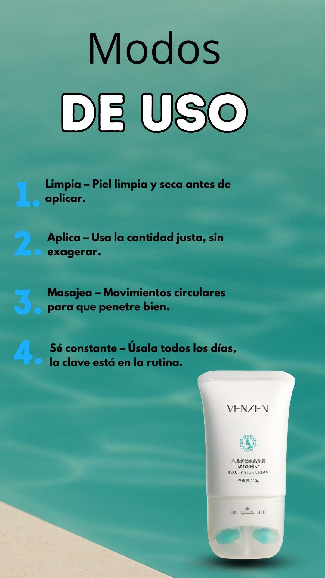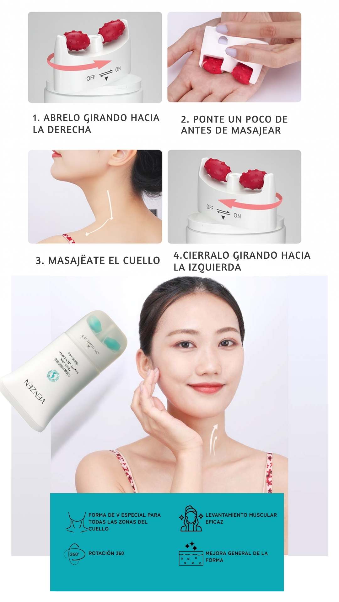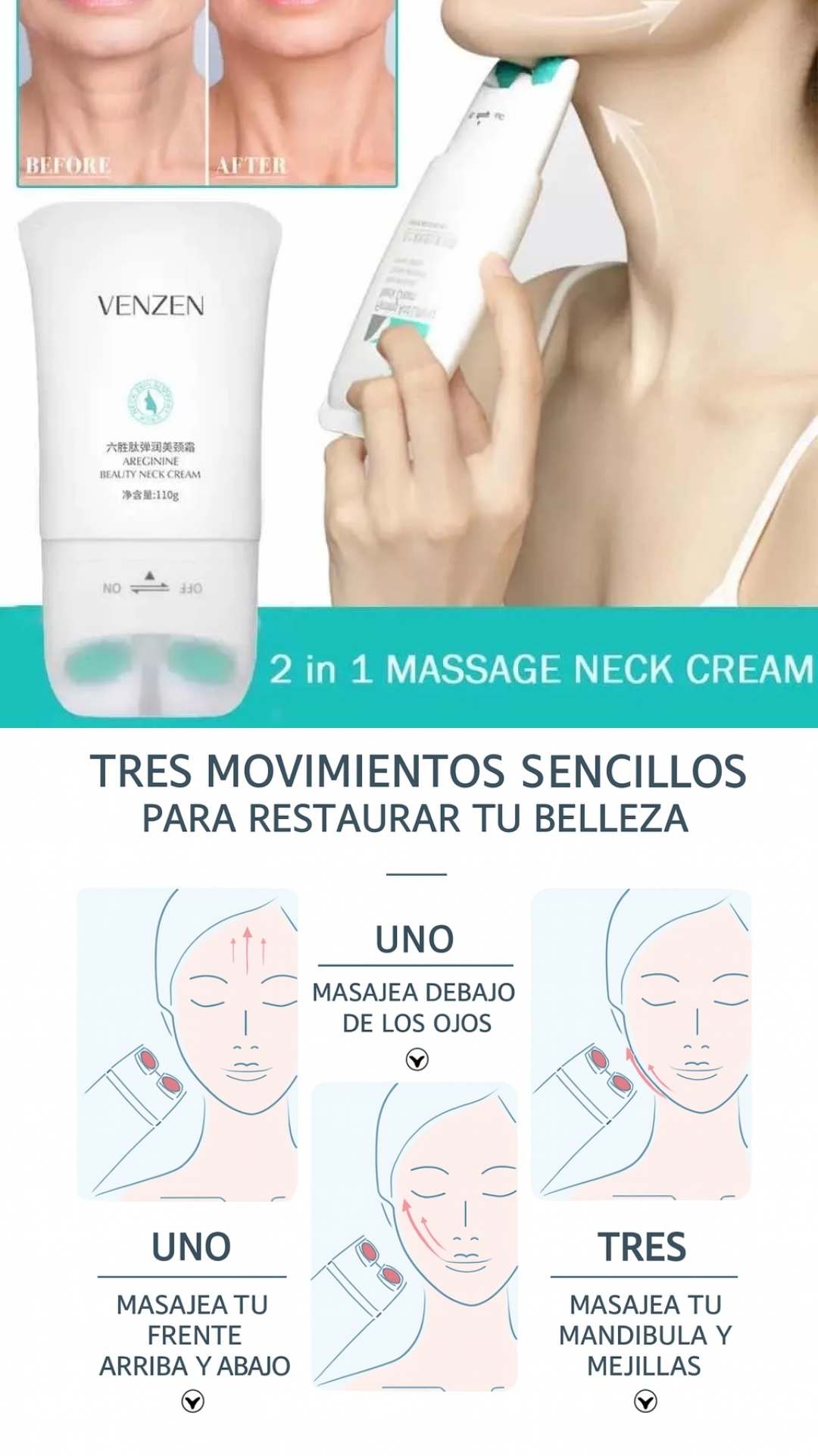 Está diseñada para reafirmar y alisar la piel del cuello, papada, escote, brazos, abdomen y rostro, ayudando a mejorar la firmeza y elasticidad en todas esas áreas.
